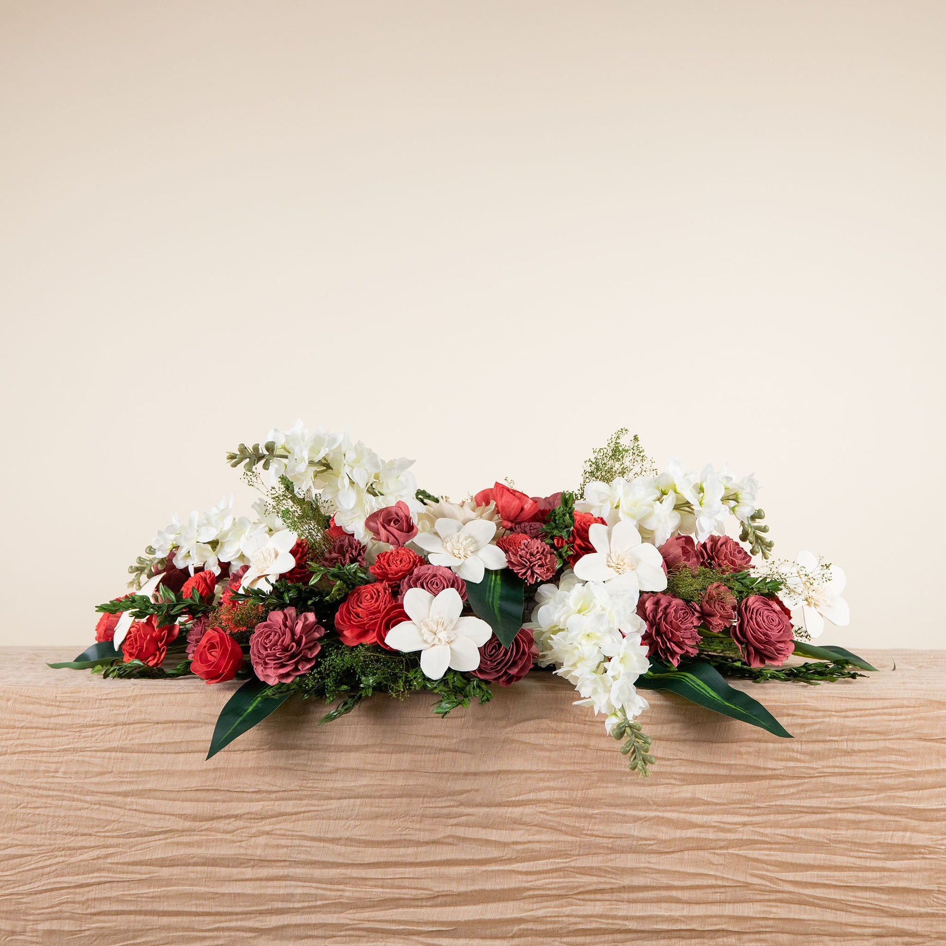 Crafted with rich tones of burgundy and ruby red, balanced by serene white flowers, this casket spray offers a powerful expression of love. Labyrinth Dahlia and Stargazer Lily accents complete this heartfelt farewell. Ready to ship with expedited options.